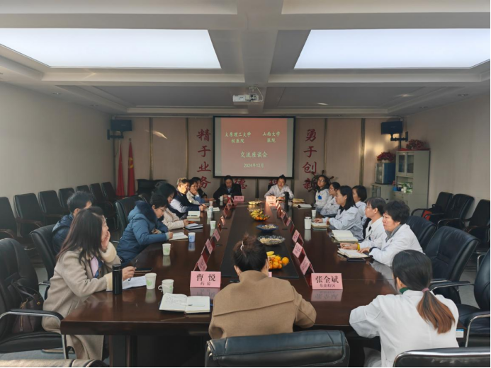 山西大学校医院院长龙雅丽带领分管副院长和各科室主任对大家的到来表示热烈的欢迎。双方围绕各自医院的服务范围、人员配置、科室设置、设备运行及开展业务项目等方面的工作进行了深入细致的交流。会中,大家还深入各科室实地对山西大学校医院进行了参观。